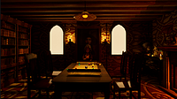 I want a cosy, maybe decorated room that looks like a made-up fantasy tavern. At the start of the story, the players all walk into this room as the dungeon master waits for them. The story will cut ba...